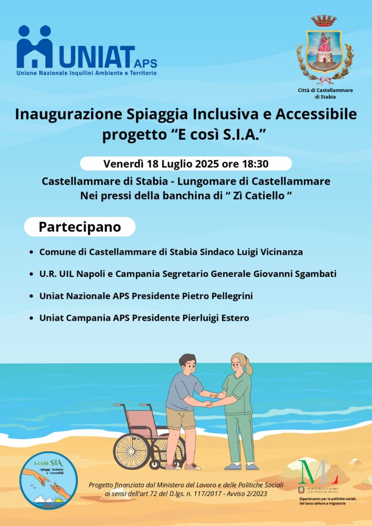 Siamo orgogliosi di annunciare l’inaugurazione ufficiale della Spiaggia Inclusiva realizzata nell’ambito del progetto “e Così S.I.A. – Spiagge Inclusive e Accessibili“, promosso da UNIAT Nazionale APS e UNIAT Campania APS, con il finanziamento del Ministero del Lavoro e delle Politiche Sociali e la preziosa collaborazione del Comune di Castellammare di Stabia.